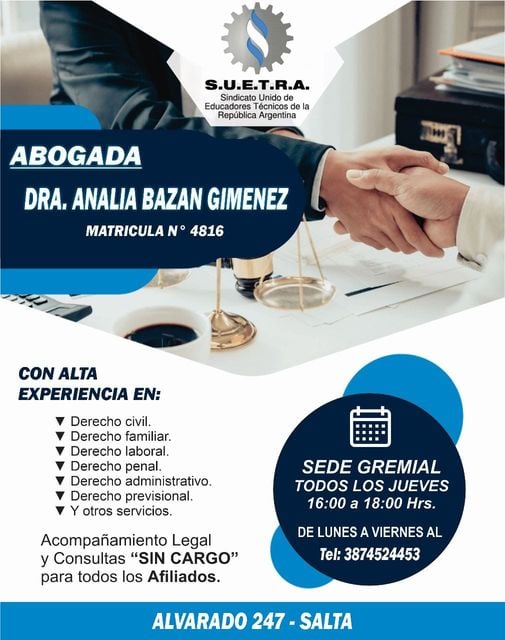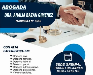 La doctora Analia Bazan Gimenez, con matrícula n°4816, ofrece asesoría legal a todos nuestros afiliados. Cuenta con una amplia experiencia en áreas como educación, previsional, administrativo y laboral. Gracias a su conocimiento y profesionalismo, brinda soluciones efectivas a los problemas legales que puedan surgir en estas áreas. La doctora Bazan Gimenez se destaca por su compromiso con la defensa de los derechos de sus clientes y su capacidad para analizar y resolver situaciones legales complejas. Ya sea que necesite asesoramiento en temas educativos, reclamaciones previsionales, asuntos administrativos o laborales, puede confiar en la experiencia y habilidades de la doctora Bazan Gimenez.