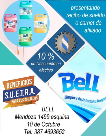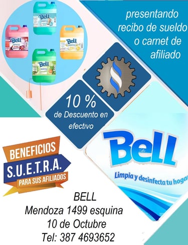 Desde SUETRA, hemos llegado a un acuerdo con BELL productos de limpieza para ofrecer a todos nuestros afiliados un descuento del 10% en efectivo o débito. Esta promoción es una forma de brindarles a nuestros afiliados la oportunidad de adquirir productos de limpieza de alta calidad a un precio más accesible. En SUETRA siempre buscamos beneficios y ventajas para nuestros afiliados, y esta colaboración con BELL productos de limpieza es solo una muestra más de nuestro compromiso con su bienestar. Agradecemos a BELL por su disposición y apoyo en esta iniciativa y animamos a todos nuestros afiliados a aprovechar esta oportunidad para mantener sus hogares y espacios limpios y saludables.