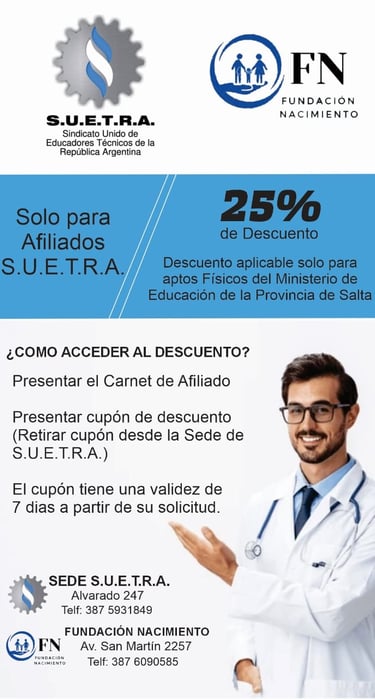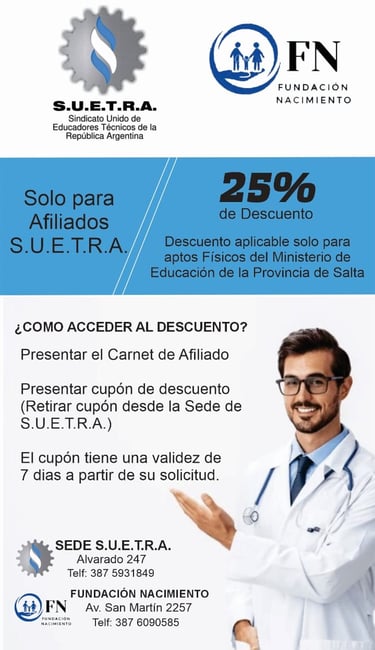 El sindicato de SUETRA ofrece un convenio exclusivo para sus afiliados, que les otorga un descuento del 25% en la realización de aptos físicos. Este beneficio es intransferible y garantiza una excelente atención para aquellos que lo aprovechen. Este convenio representa una gran ventaja para los afiliados, quienes podrán disfrutar de un servicio de calidad a un precio reducido.